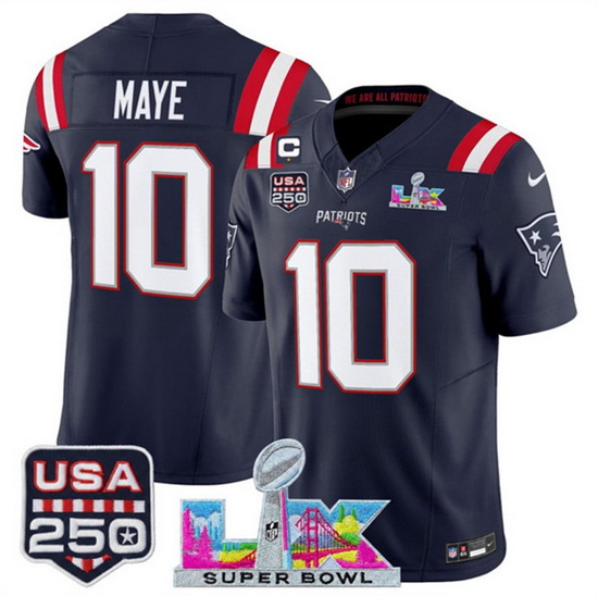 Men New England Patriots 10 Drake Maye Navy 2025 F U S E 1 Star C Patch And Super Bowl LX Patch USA 250 Patch Vapor Limited Football Stitched Jersey